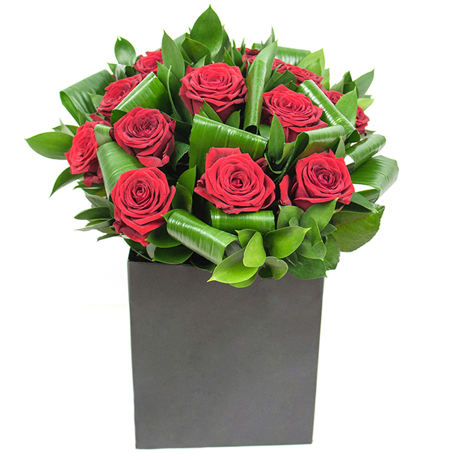 Experience the charm of our red rose arrangement, thoughtfully combined with vibrant aspidistra leaves and elegant ruscus. This unique bouquet brings together colorful beauty and sophisticated design to brighten any home.